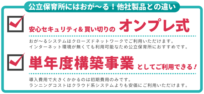 おが~るシステムは保育士の日々の業務負担の軽減を目的として、自治体と大学との共同研究により開発されました。子育ての現場でICTが持つ可能性を最大限引き出せるようバージョンアップを重ねてます。