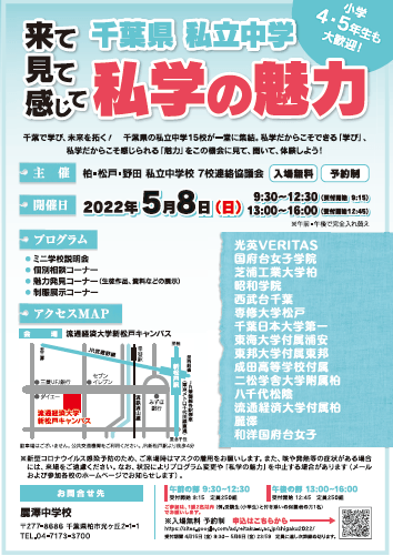 そこでそれぞれの伝統と独自の校風を保持する柏・松戸・野田の3市の私学7校(麗澤・専修大学松戸・芝浦工業大学柏・二松学舎大学附属柏・西武台千葉・光英VERITAS・流通経済大学付属柏)が主催し、共同で地域教育の活性化を目指し合同説明会を開催します。