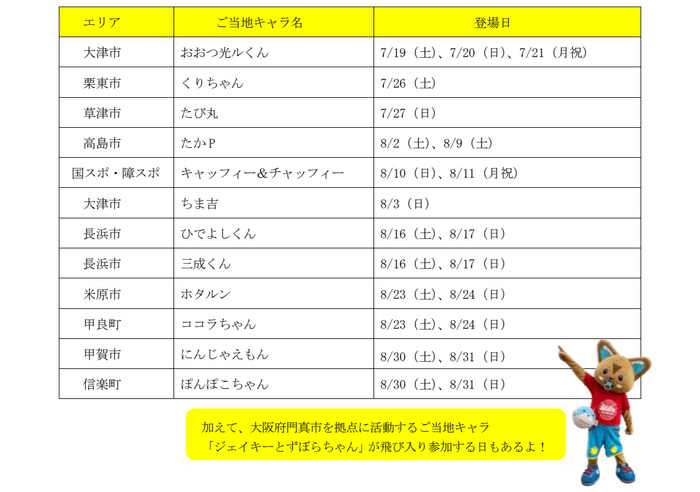 滋賀県内には、個性豊かなご当地キャラが各地に点在しており、それぞれが地域や施設のPR活動を行っています。今回のイベントでは、“県内のご当地キャラが夏休みのミシガンに遊びに来た!”をテーマに、県内各地のご当地キャラが日替わりで毎週末、大津港に登場します。