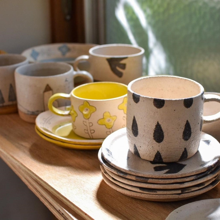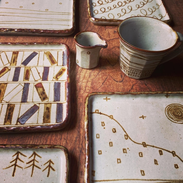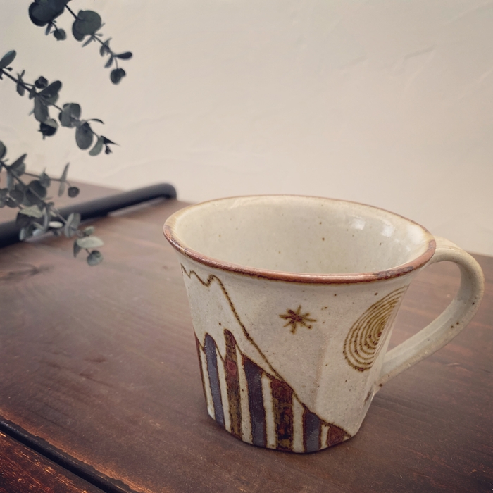 山梨県忍野村、富士山の麓で作陶しており、素朴な色合いの器に身近なモノや風景をモチーフにして「線掘り」という技法で絵柄を描く。日常使いをしてほしいとの想いから、カップ類は軽くなるように仕上げている。電子レンジ、食洗機での使用が可能。