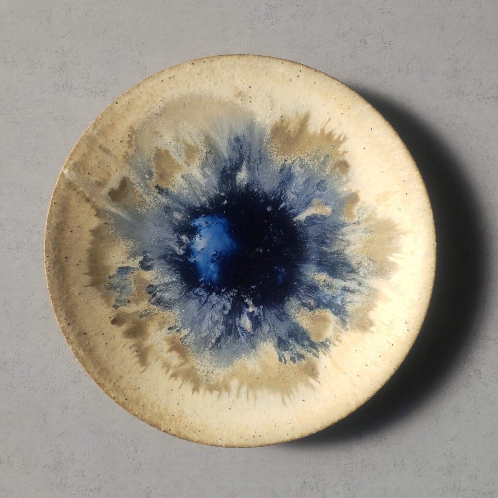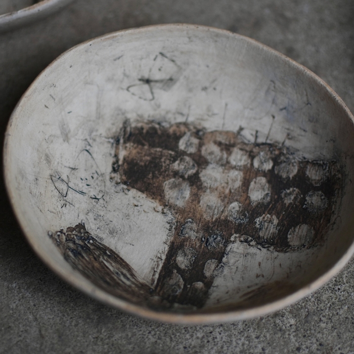神奈川大磯の海の近くで自然を感じながら制作している。生命が転生し生まれ変わる輪廻をモチーフにした絵と、少しゆがませた不完全な形で“自然体”を表現する。手描きならではのやわらかい風合いを大切に、ひとつひとつ形から絵まですべて手作りの1点物。電子レンジや食洗機で使用可能。