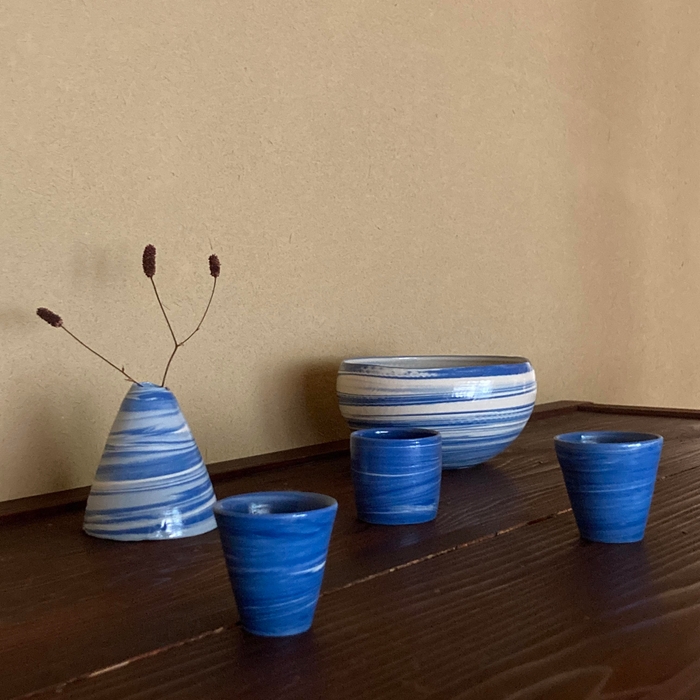 鹿児島出身。有田の窯元や異業種で働きながら作陶を続け、結婚を機に湘南へ。2017年に自分の窯を持ち、現在神奈川県大磯の自宅で作陶中。食器、植木鉢、カヤリ、アクセサリーなど、暮らしの中にあったら良いなと思うものを形にし、普段に使ってもらえるよう丈夫な作りを目指している。今回の展示の見どころは新作「seino blue」。白い土に青い顔料を混ぜて色々な青い土を作り、数種類の土を重ねて捏ねてロクロで挽いて成形。さまざまな青から成る表情豊かなうつわを楽しめる。電子レンジ、食洗機は使用可。オーブン不可。