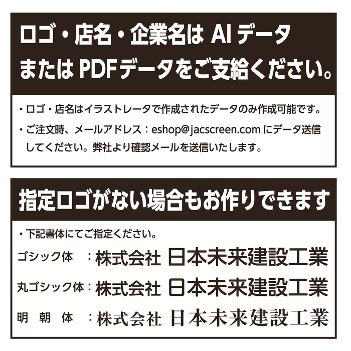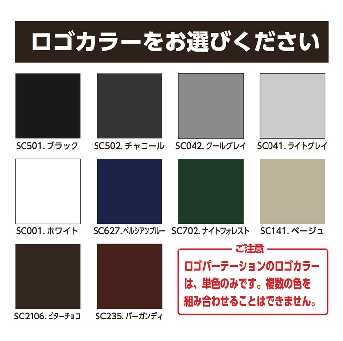 名入れについては、お好きな色(10色)お好きな書体(3種類)から選んで頂くことであなた好みのパーテーションを作ることが可能です。ロゴがある場合でも10色よりお選び頂けます。文字数は20文字まで可能です。