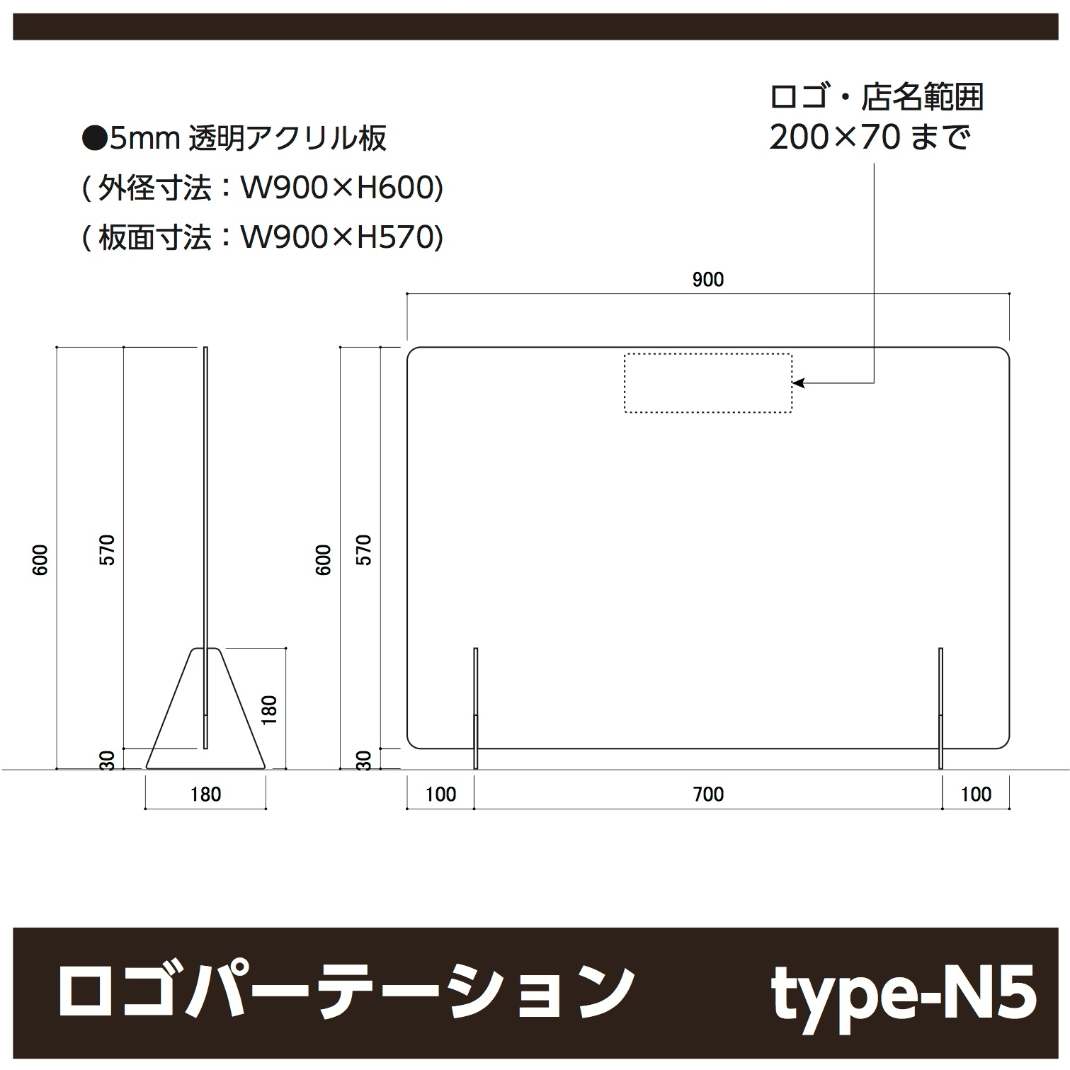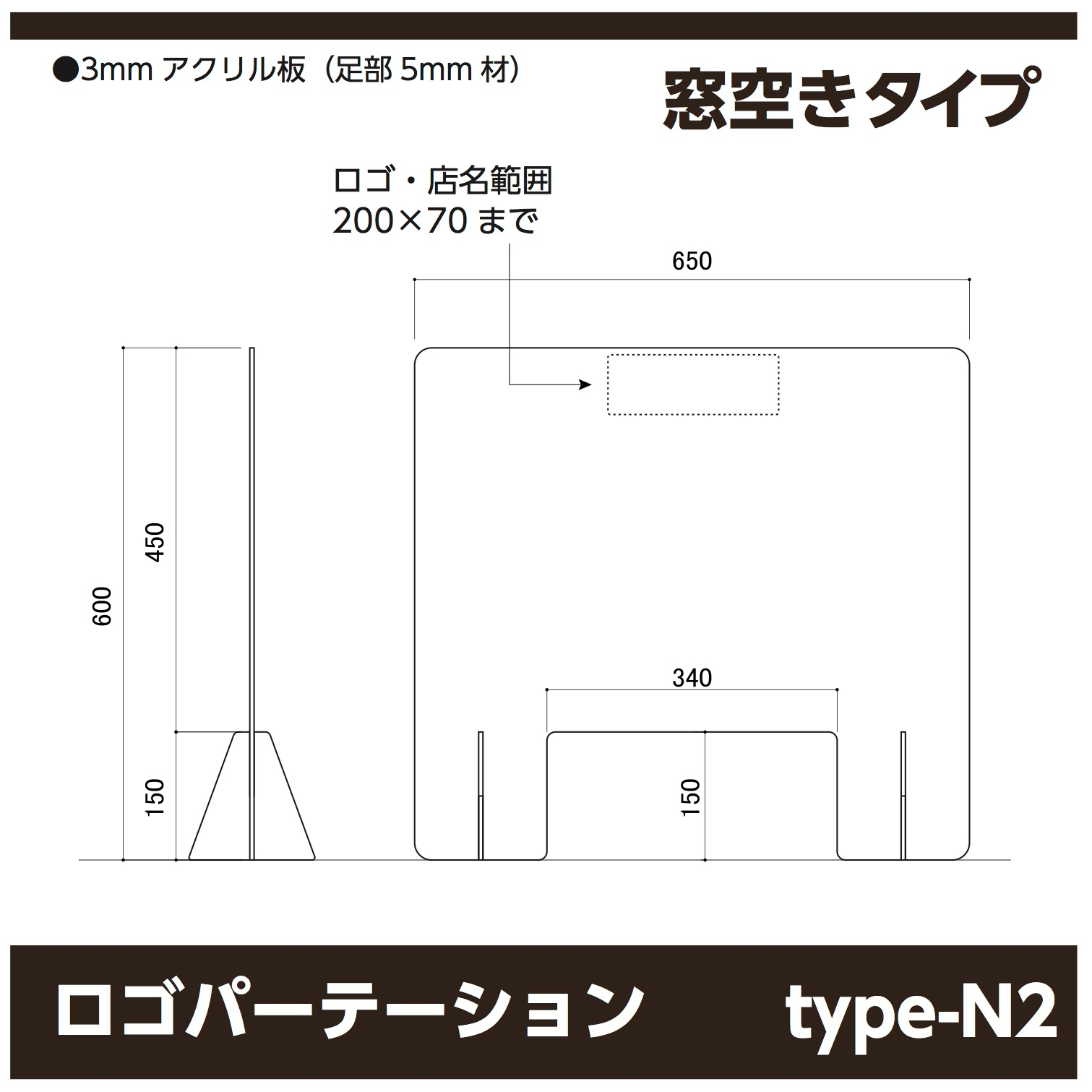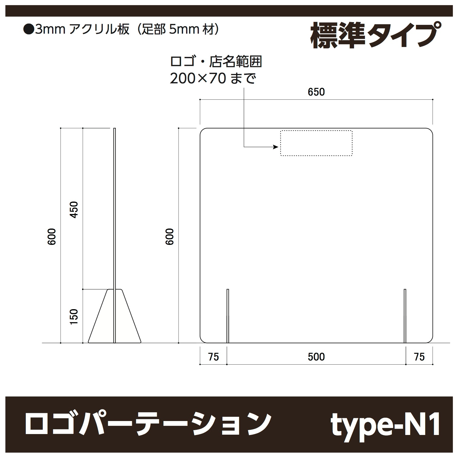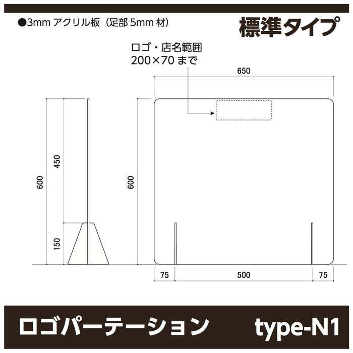 ロゴ・名入れ可能なパーテーションは全部で5種類。W650の標準タイプから、窓空き、底上げ、幅広のW900,W1200まで数多く取り揃えております。全て高さが統一されている為、組み合わせも自由自在。並べてもバラツキがありません。脚は差し込み式になっているので工具不要で簡単に設置が出来ます。
