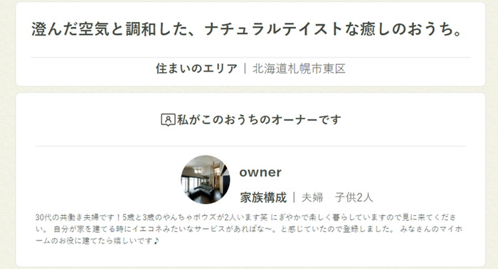 「イエコネ」では住宅会社を通さず、家を建てたオーナーとこれから家を建てたい見学者の2組で見学を行っていただくという特徴があります。住宅会社が介入しない分、見学先のオーナーがどのような人か、おうちを見学する前に知りたいという要望を多くいただき、おうち紹介ページへのオーナー情報記載に至りました。