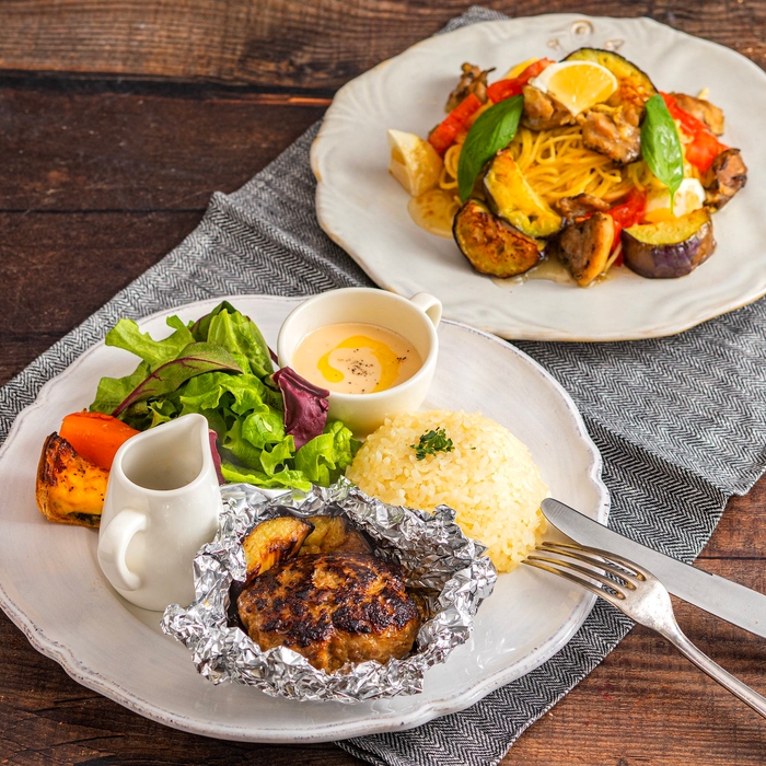 メインには和牛オリンピックで4大会連続内閣総理大臣賞を受賞するなど、間違いない美味しさの「宮崎牛」を使用したハンバーグや、日向夏と炭火チキンを合わせたパスタなど、他では食べられないメニューが楽しめます。