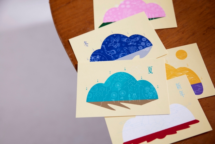 春夏秋冬に新年をプラスした5枚セットで、おもてには、それぞれの季節の山に関する季語をイメージしたイラストレーションと二十四節気を、裏にはその季節の季語をたくさんちりばめました。暑中見舞や年賀状などにもぴったりです。