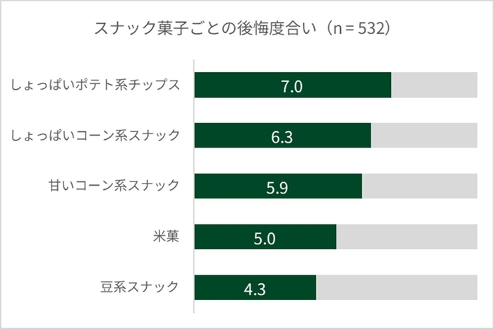 ・後悔度(10段階評価の平均)は、「しょっぱいポテト系」が7.0で最高。米菓(5.1)・豆系(4.7)は相対的に低く、