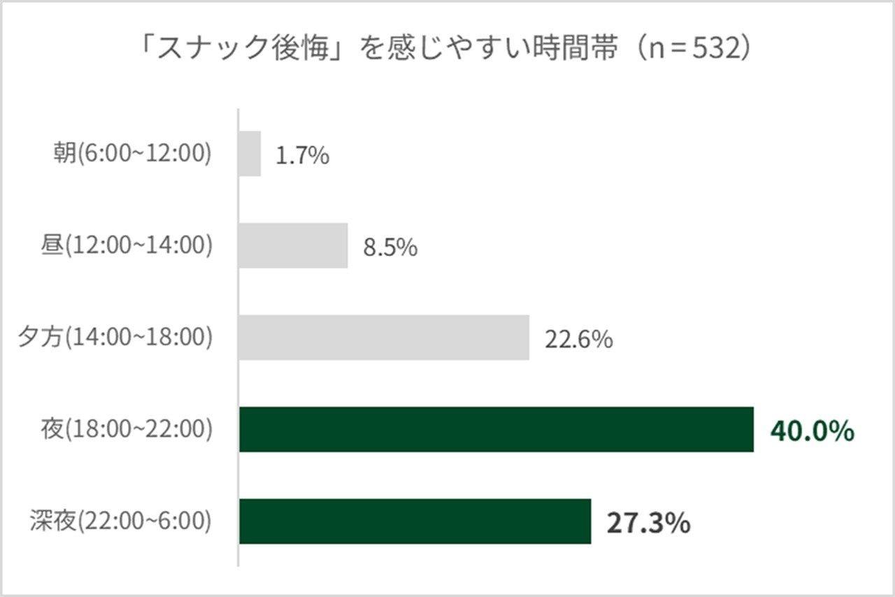 「最も後悔しやすい時間帯」は夜(18:00~22:00)が40%、深夜(22:00~6:00)が27%と夜間に集中して仕事終わり~就寝前のリラックスタイムほどスナック菓子を食べる誘惑に負けやすく、食べる時間帯と後悔が結びついていることが明らかになりました。