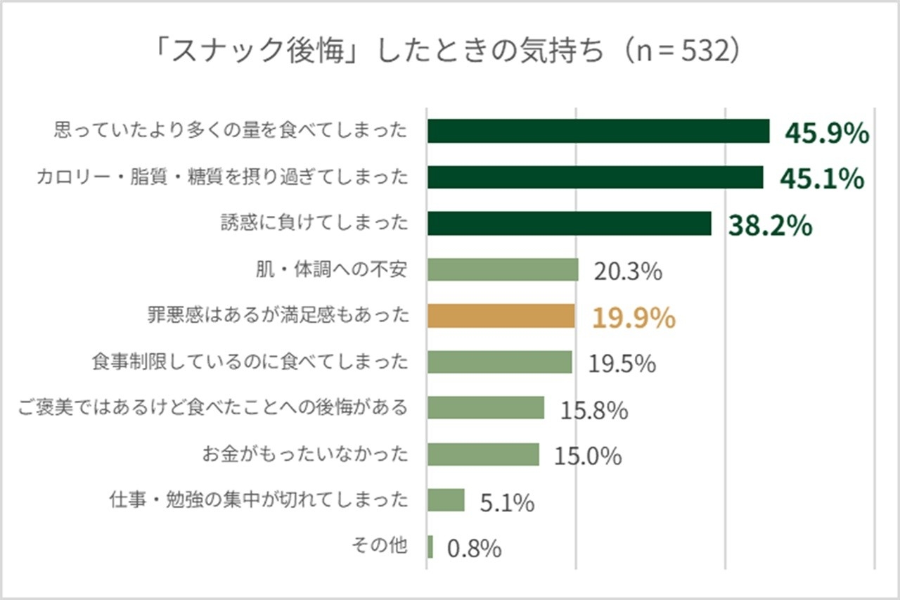 “スナック後悔”を感じる理由の上位は、「思っていたより多く食べた(45.9%)」「カロリー等の摂り過ぎ(45.1%)」「誘惑に負けた(38.2%)」。一方で「罪悪感はあるが満足感もあった(19.9%)」も一定数を占め、ストレスケアやご褒美としての文脈も見受けられました。“スナック後悔”は単に「太るから後悔する」という一面的なものではなく、“罪悪感”と“幸福感”が共存するスナック菓子体験が日常的に生じているといえます。