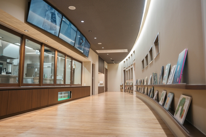 どんな風に料理が作られているのか4つのモニターに映し出し、子どもたちが見られるようにしています。家庭では台所は子どもたちの目線より上にあり、まな板や包丁を使っているシーンをなかなか見ることがないと思いますが、自分たちが食べるものが目の前で作られている様子に子どもたちは興味を持ちますし、「今日のごはんなに?」とガラスの扉越しに調理の先生に聞くようになりました。作ってくれる人がいるから食事が取れるということを伝えながら、従来だとあまり見えないキッチンをオープンにして、調理の先生と子どもたちの交流を大切にしています。