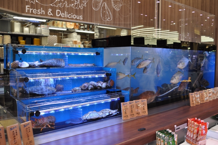 『ライフ初導入』となる「貝・えび用水槽」も含めた合計2.7mの大型水槽を設置し、お客様に『最高鮮度』のお魚をご提供いたします。