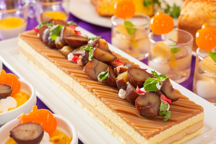 カボチャクリームを挟み込んで仕上げたショートケーキに、低温で仕上げたカボチャプリンを組み合わせた「カボチャプリンのショートケーキ」や、お店で焼き上げたメープルシロップの風味豊かなロール生地に濃厚なカボチャカスタードを包み込んだ「カボチャクリームのロールケーキ」、シフォン生地にカボチャのピュレを練り込みカボチャの風味が香る「カボチャのシフォンケーキ」などハロウィンならではのカボチャを使用したスイーツをご用意。カボチャだけでなく、さつま芋やマロン、ラ・フランスやリンゴなど秋を満喫できる素材を使用した「さつま芋のパウンドケーキ」、「モンブランタルト」、「マロンケーキ」、「ラ・フランスのムース」、「リンゴキャラメルムケーキ」など全20種類のスイーツが