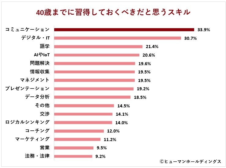 ●「40歳までに習得しておくべきスキル」は、1位「コミュニケーション」、2位「デジタル・IT」、3位「語学」