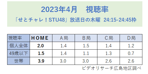 【せとチャレ!STU48】2023年4月・月間視聴率<世帯・個人全体・U49>いずれも1位