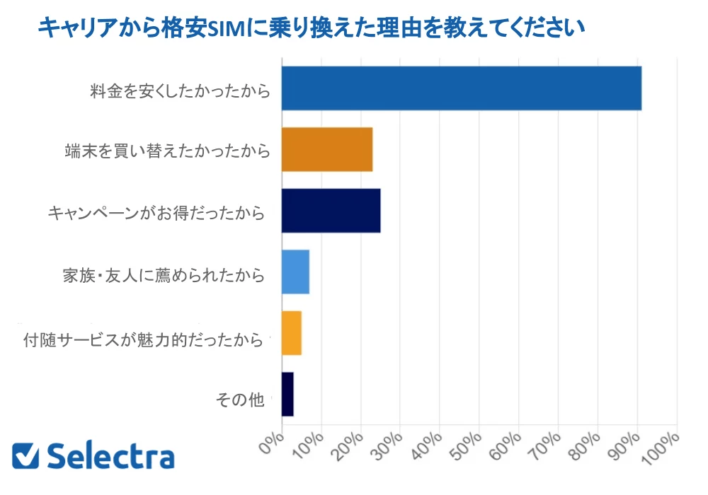 セレクトラ・ジャパン株式会社/SelectraJapan K.K.(代表取締役:グザビエ・ピノン)は、2年以内に大手キャリア(au・ドコモ・ソフトバンク)から格安SIMに乗り換えた男女100人に対してアンケートを実施しました。