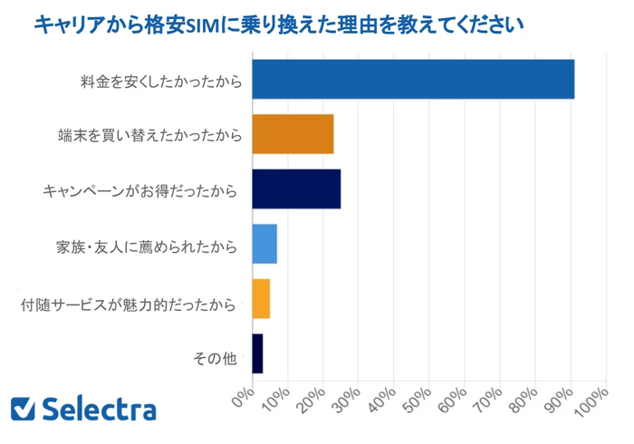 格安SIMに乗り換えた理由について、91%の人が「(月額)料金を安くしたかった」と答えています。