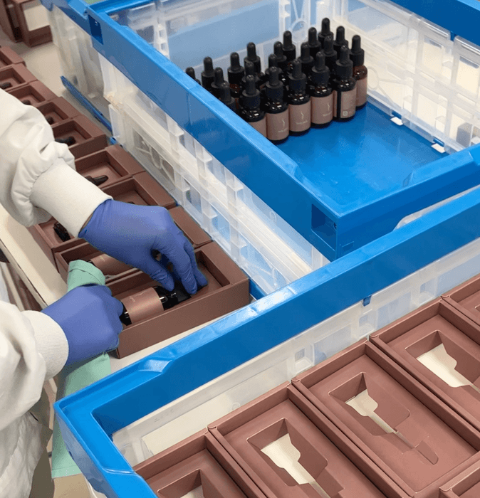安全性・生産性・衛生面など、良質な化粧品を作るための品質管理を徹底して行っています。自主基準のGMPを設け、ISO9001認証を受けた工場ラインにおいて、厳しい品質管理のもと、安心・安全な製品を一つひとつ手作業で製造し、お客さまに提供しています。