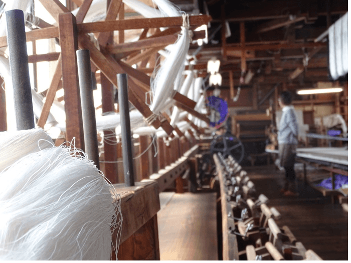 効率化が求められる現代においても、素材の持つ風合いを損なわない為に、先端設備に頼ることなく、手織りはもちろんのこと、大半の工程を手仕事で行っております。生糸を精練し絹糸にし、撚糸、図柄の設計、絣作り、整糸など大半の工程を自社工場で行っております。