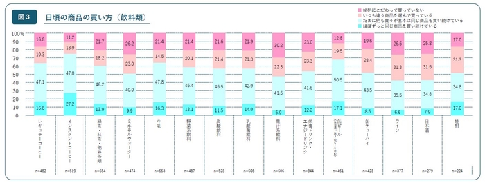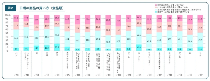 【図2】は「食品類」の結果である。全体的には「ほぼずっと同じ商品を買い続けている」が1割程度、「たまに他も買うが基本は同じ商品を買い続けている」が3~5割で、《継続派》は概ね4~6割となった。《継続派》が最も高い食品類は「納豆」の67.4%で、「ヨーグルト」67.2%も僅差で続く。以降「ハム・ウインナー・ベーコン」65.9%、「豆腐」60.7%という順で、他は6割未満である。
