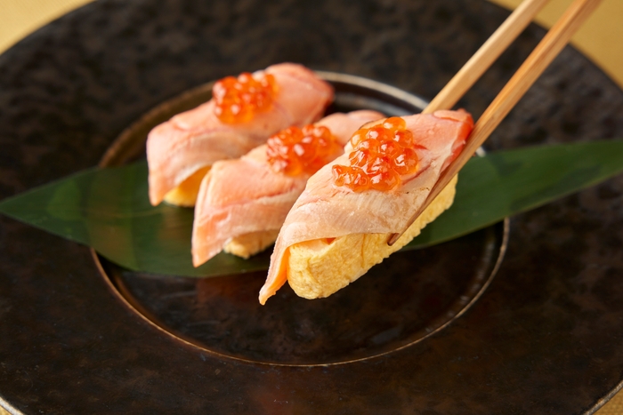 チーズ入り出汁巻たまごをシャリに見立て、サーモンの親子をネタにした一品。