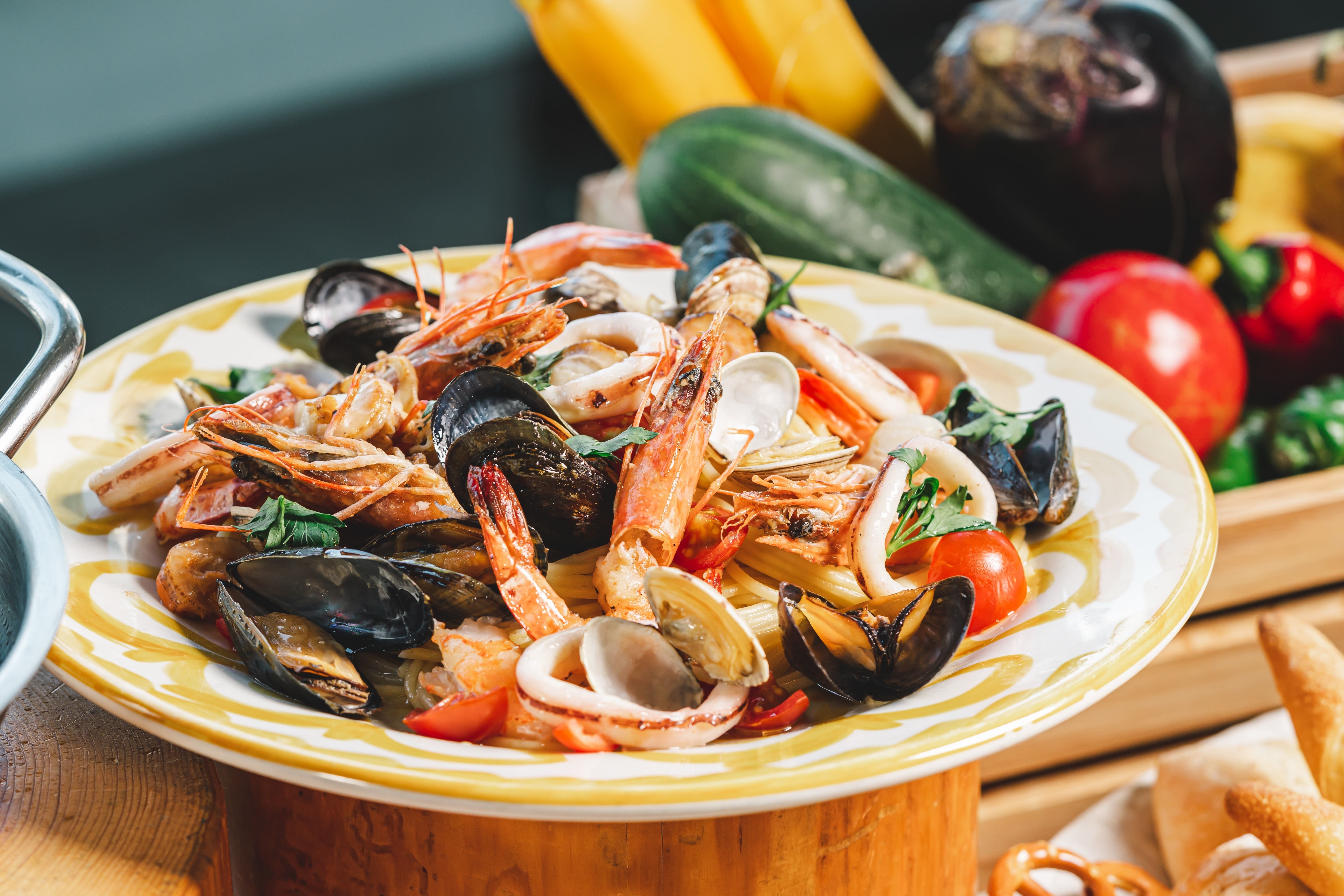 オープンキッチンからフレッシュなままご提供する料理の数々。季節の食材をたっぷり使用した本場のイタリアンを思う存分楽しめるのも当店ならでは。お好きなドレッシングやソースで楽しむ新鮮野菜、旬の食材をふんだんに使用した前菜をはじめ魚介の旨味が溢れるパスタや、窯で焼くからこそ味わえる香ばしい焼きたてピッツァ、長時間じっくり低温で仕上げたローストポークを満足ゆくまでご堪能いただけます。