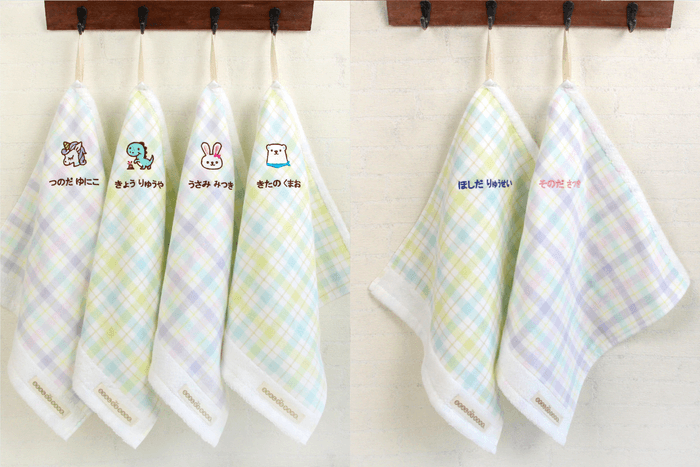 保育園・幼稚園で使用するタオルは、一般的なハンドタオルよりも大判タイプのループつきを指定する園が多いため、その規格で展開しています。見た目のカワイさだけではなく肌触り等にもこだわっています。