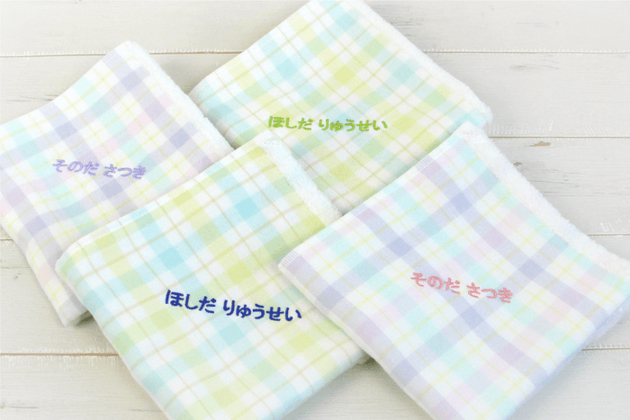 文字の読めない年齢のお子さまが使用しても、自分のものと認識しやすくなるようにイラスト刺繍を大きめに入れています。イラストの入らないお名前のみは、タオルの色に合わせて約600種類の色からデザイナーが厳選した色となっています。