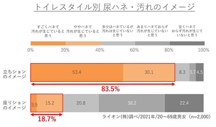 実際に小用のスタイルによる尿ハネ・汚れへの印象を聞いたところ、立ちションでは「尿がハネて汚れが生じていると思う」という人は83.5%の一方、座りションでは、18.7%にとどまりました。立ちションは、尿ハネでトイレを汚すイメージが強く、座りションなら、尿ハネ汚れを避けられるというイメージがあるようです。