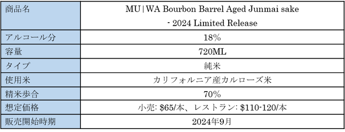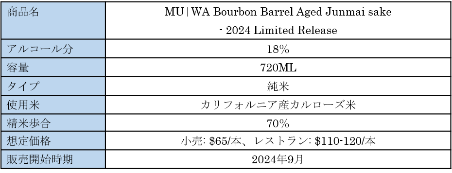 2024年9月に高付加価値タイプの新ブランドとして新発売した「MU|WA※1」は、純米酒をバーボン樽で貯蔵した新しいタイプの熟成SAKEで、米国産バーボンの風味と米国産純米酒のハーモニーが楽しめます。純米酒ならでは旨みやコクに加え、バーボン樽由来のスパイシーな香りと果実味が溶け込んだ味わいが特徴です。肉料理やチーズ、シーフードなど幅広い料理との相性が良く、日本食レストランのみならず、フュージョン料理店など様々なレストランでの販売を強化します。