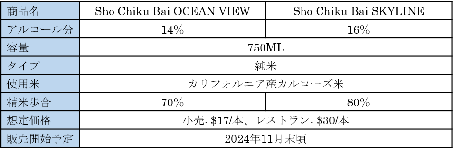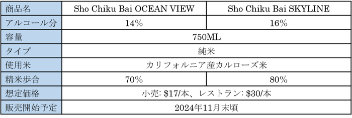 11月に新発売する「Sho Chiku Bai OCEAN VIEW※2」「Sho Chiku Bai SKYLINE※2」は、ワインユーザーをターゲットに、米国の魚料理や肉料理とのマリアージュを楽しんでいただくための、高酸度の酒質が特徴の新しい普及タイプのSAKEで、ワインと清酒の架け橋となる純米酒を目指して開発しました。「OCEAN VIEW」は、爽やかな酸味が特徴で、牡蠣などのシーフードとのマリアージュが楽しめ、「SKYLINE」は、深みとコクのある味わいが特徴で、肉料理との相性が抜群です。