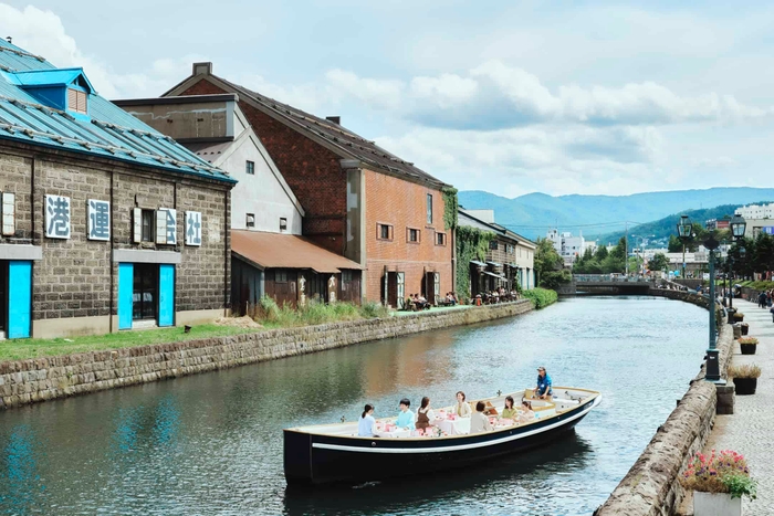 通常、小樽運河で運航している船はベンチ席ですが、本プログラムではテーブル付の船を運航。アフタヌーンティーをゆっくりと楽しめるよう、テーブルクロスやクッションを船内に設えます。約40分間の乗船中は、心地良い春の陽気を感じながら、歴史的建造物が建ち並ぶ小樽の街並みを眺める、優雅なクルージングを楽しめます。