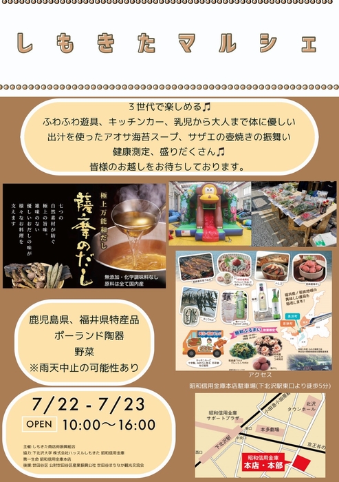 株式会社URリンケージ(本社:江東区)は、鹿児島県で無添加、化学調味料なしの極上万能和だしを作っている「ぶえん亭」と協力し、薩摩のだしやだしの効いたカレー、味噌汁を販売するマルシェを2023年7月22日(土)~23日(日)に昭和信用金庫本店駐車場(以下、しもきたマルシェ)にて開催いたします。さらに、2日間限定で松川浦の名産である青のりを使ったあおさスープの振る舞いを行います。(スープは薩摩のだしを使用します)