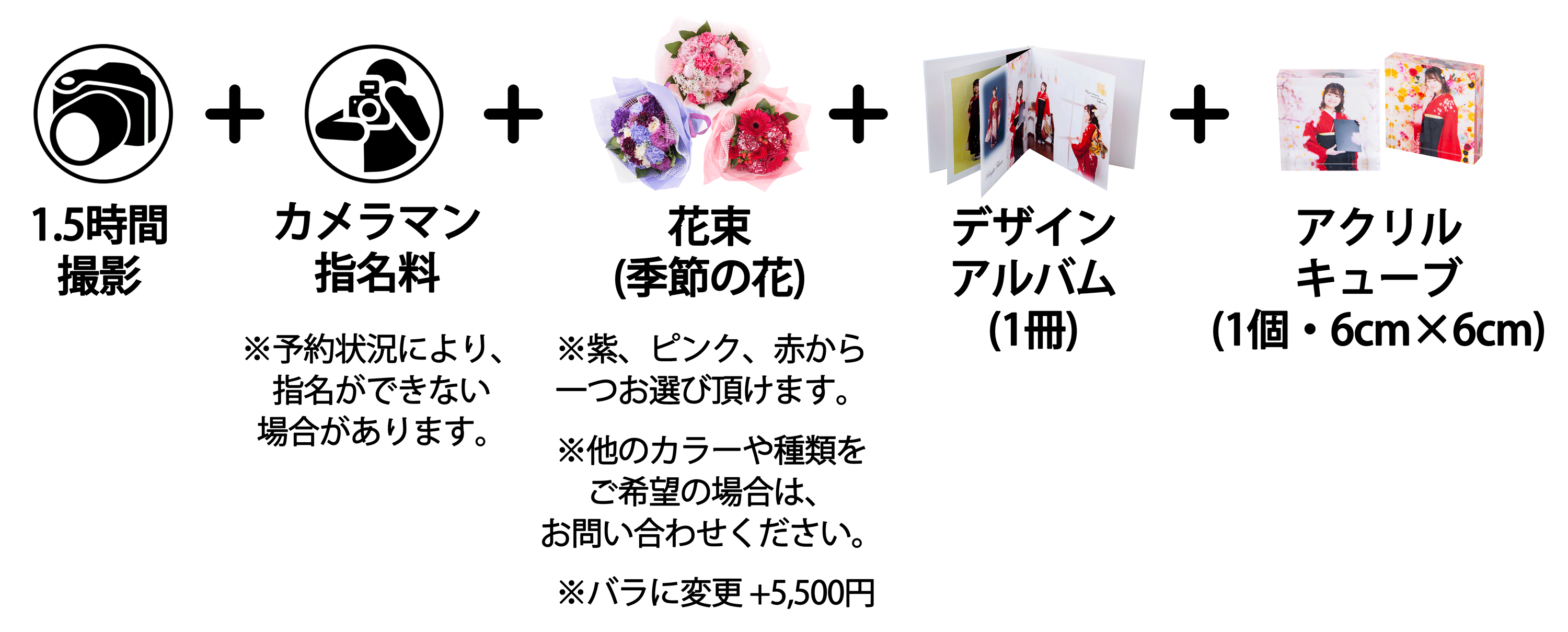 本プランでは、プロポーズという特別な瞬間を彩るため、経験豊富なカメラマンによる1時間半にわたる撮影で約200枚の写真を提供します。さらに、花束のご用意やカメラマンの指名が可能で、お客様一人ひとりに合わせた特別な演出をサポートいたします。撮影した写真は、2面アルバムに美しくまとめられ、さらに思い出を一層引き立てるアクリルキューブもプレゼントとしてご用意しています。