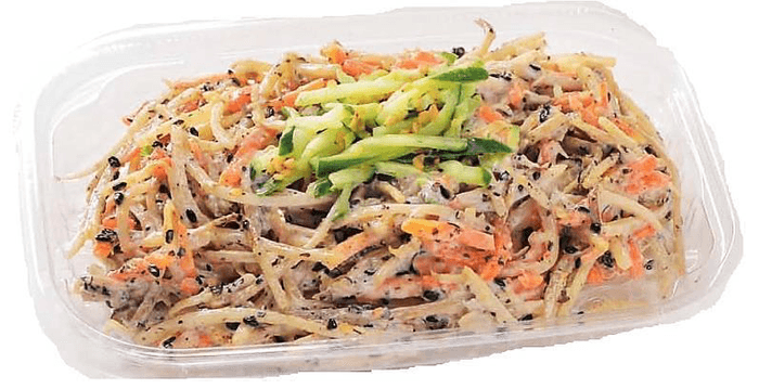 ごぼうの歯ごたえと香りをお楽しみいただけるサラダにしたいと思いリニューアルしました。皮付きの細切りごぼうを炒めて水分をとばすことで、シャキシャキとした食感を味わうことができます。ごぼう本来の風味を活かすため、味付けを何度も試作しました。ごぼうの強い風味に負けないよう、ごぼうと相性と良いごまをふんだんに使用したほか、隠し味にあごだしつゆ入りの白だしを入れ、和風の味付けに仕上げました。ぜひお試しください!