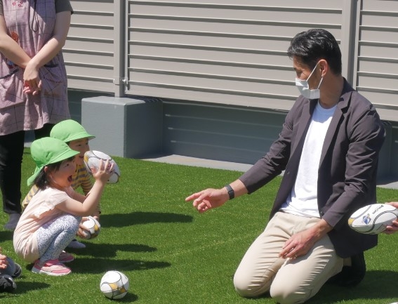 イベントでは、廣瀬氏が保育園の屋上庭園に登場し、子供たちにラグビーボールを手渡しでプレゼントしました。また、ストレートパス、スクリューパス、オフロードパスなども披露し、子どもたちとラグビーを通じて触れ合いました。子供たちは、廣瀬氏と一緒にボールを投げたり追いかけたりし、終始楽しい様子で遊んでいました。