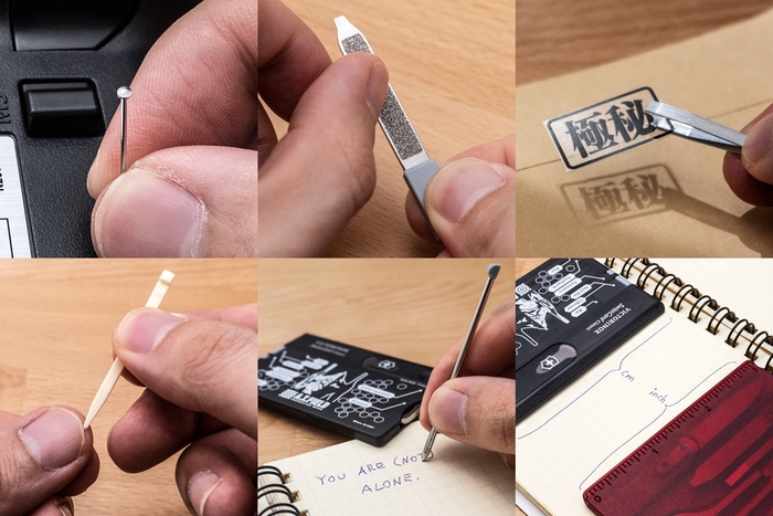 日常生活や旅行先で便利な10個のツール(レターオープナー・はさみ・ピン・つめやすり・マイナスドライバー・ピンセット(毛抜き)・つまようじ・ボールペン・スケール(cm & inch))を搭載。