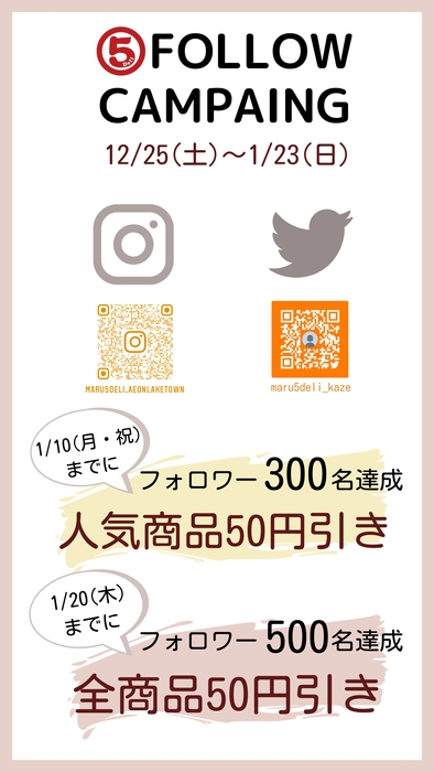 1/10(月・祝)までにSNSのフォロワー300人達成でお得なキャンペーンを開催します。