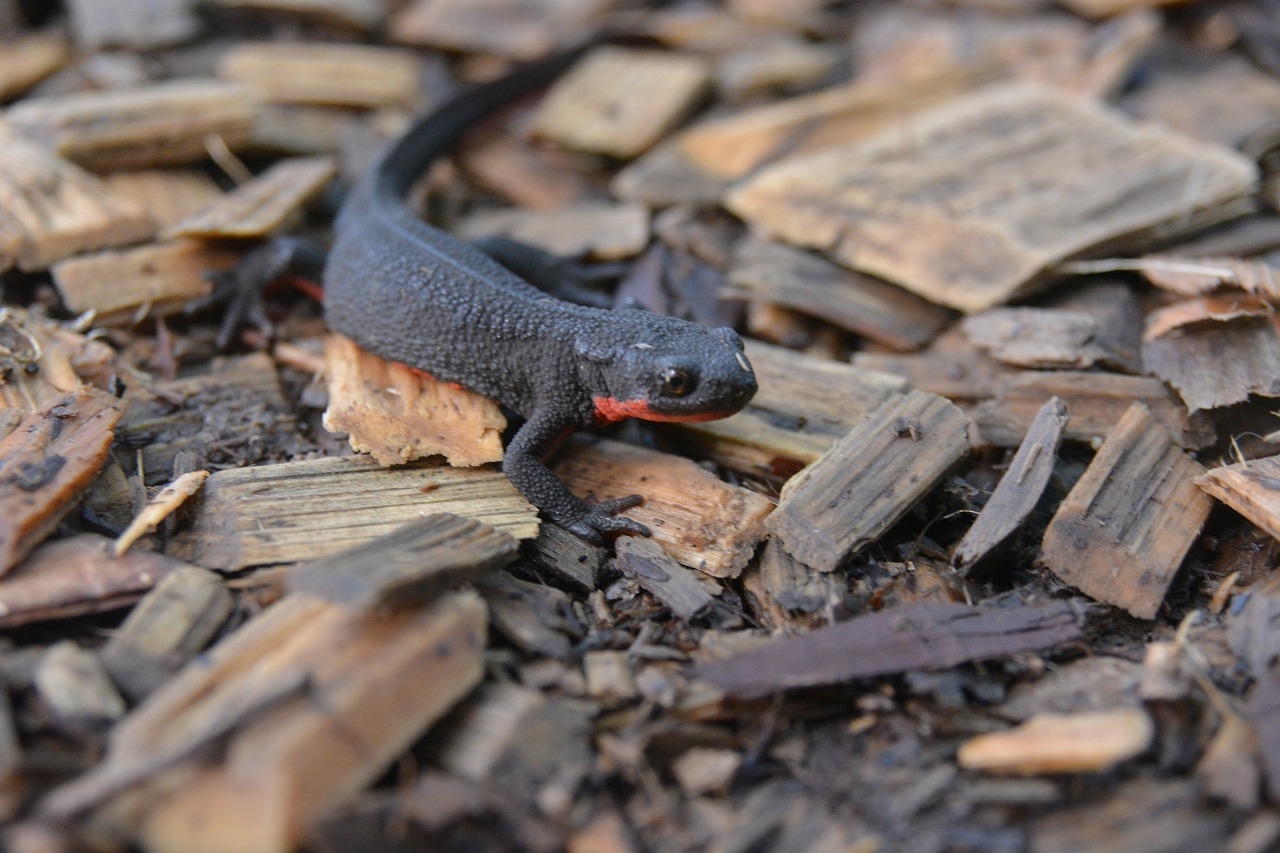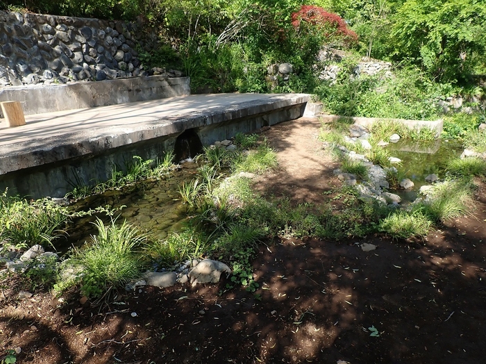 ビオトープのなだらかな傾斜や凹凸のある水底は「エコトーン」と呼ばれます。エコトーンがあることによってさまざまな水深や水分条件が生まれ、多様な生物が来る可能性が高くなります。山と谷、斜面が多い地形の奥多摩には、流れのない水たまりのような場所が少ないため、このビオトープは両生類や水生昆虫類にとって格好の産卵場所となり得ます。