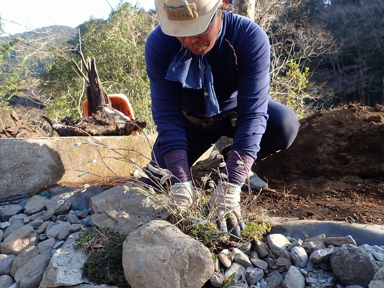 巨大な生簀を満たすためには大量の土が必要ですが、外来種が持ち込まれないよう、各所に協力いただき、地元の石材会社と交渉して、近隣の森からでた地元の土を使用。ビオトープに入れる植物も、地元のものにこだわり、水中には近隣の土地から分けていただいたセキショウを植付。常緑なので冬でも景観を維持し、太い根が石の間に入り込めば、ビオトープの地盤が安定します。陸地についても、すぐ隣の生簀の中に生えた野草を使用し、在来の中低木についても可能な限り敷地内に生えていたものを活用しました。