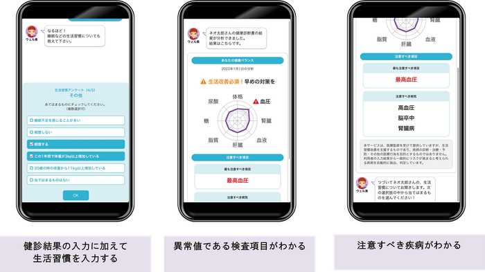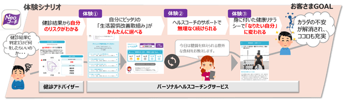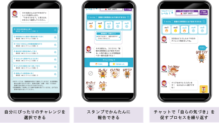 今般、本プロジェクト第1弾企画として、健診結果を改善したいが「何をしたらいいかわからない」「取組みがなかなか継続しない」等といった身近な悩みに着目し、一人ひとりのライフスタイルに合わせた生活習慣の改善取組みの提案やフィードバック等のサポートを行うアプリ「Neoコーチ」を開発しました。