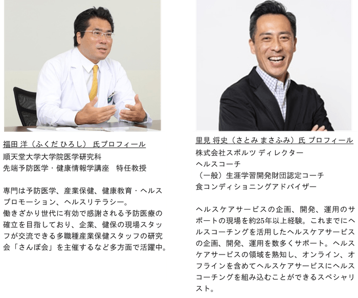本アプリでは、日本国内においてヘルスケアサービス領域を熟知し、且つヘルスコーチングの要素を整理できる専門家である里見将史氏監修のもと、「ヘルスコーチとのリアルなコミュニケーション」を体現し、お客さまに寄り添いながら「無理なく続く」行動変容をサポートします。
