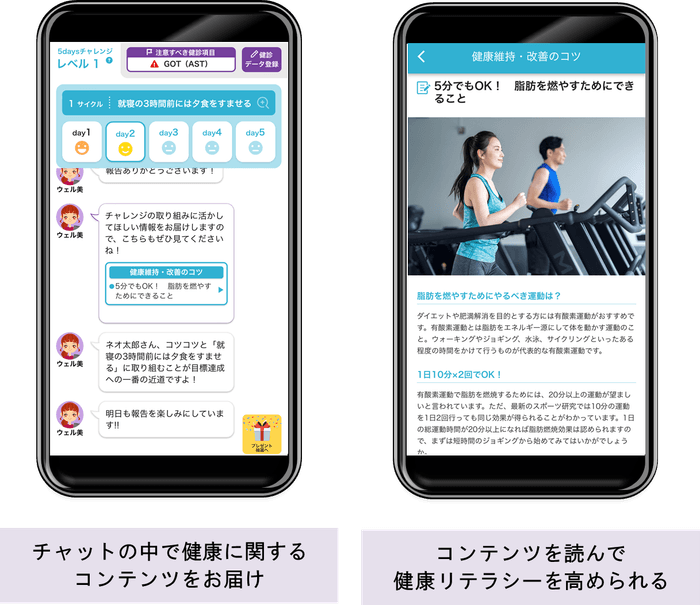 ・「健康リテラシー」を一気に習得することは困難です。そこで、本アプリは、予防医学・健康教育・ヘルスプロモーションが専門の福田洋医師や保健師の監修のもと、健康課題に合わせた「正しい知識&行動」のプロセスを繰り返すプログラムとすることで、少しずつ行動の定着、習慣化に導いていき、「健康リテラシー」を向上させる仕組みとしています。