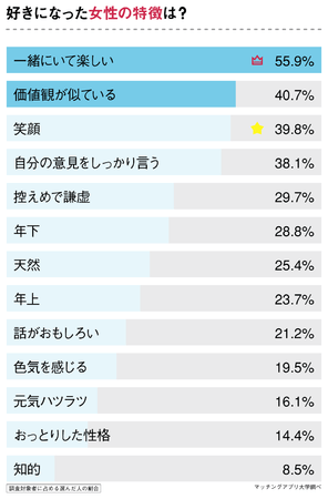 ●一緒にいて楽しい人。趣味が合う女性に惹かれることが多く、そういう女性と付き合うと長続きしました。(41歳・宮城)
