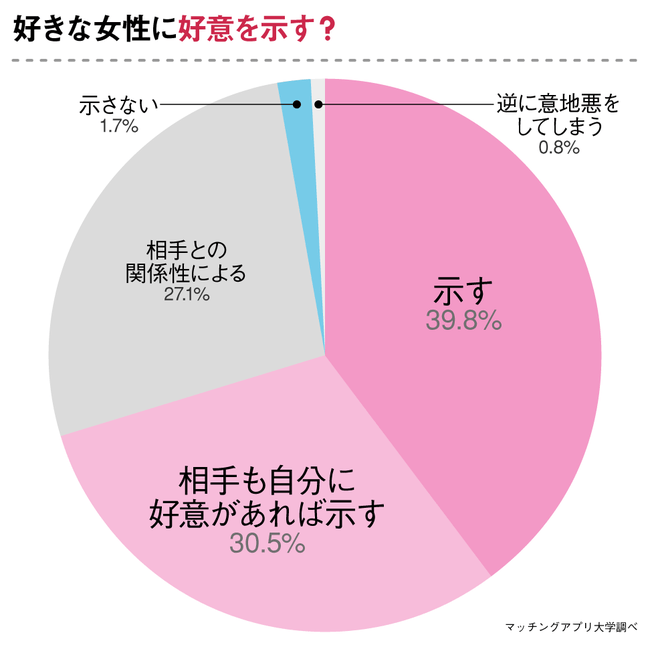 好意を「示さない」と回答したのはたった1.7%で、「逆に意地悪をしてしまう(0.8%)」と合計しても「好意を表に出さないB型男子」は2.5%でした。