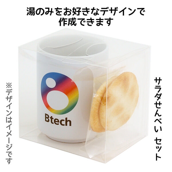 また、同サイトでは、オリジナルの[湯のみ]を作ることも可能。オリジナルロゴや写真をプリントした[湯のみ]と、さらにオリジナルのロゴやイラストをフードプリントしたせんべいをセットにしたギフトボックスも作成可能です。プリントなしのせんべいとセットにすることも可能です。