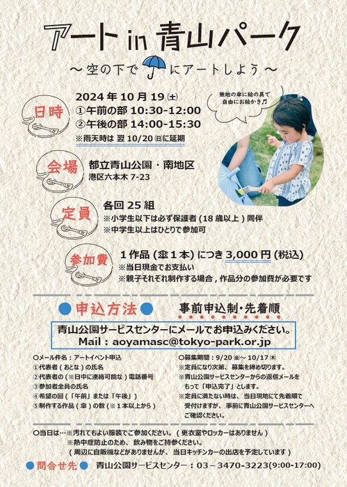※雨天時は翌10/20(日)に延期します。中止の場合は、当日の朝に参加者の方へメールを配信します。また青山公園公式X(旧Twitter)でお知らせします。