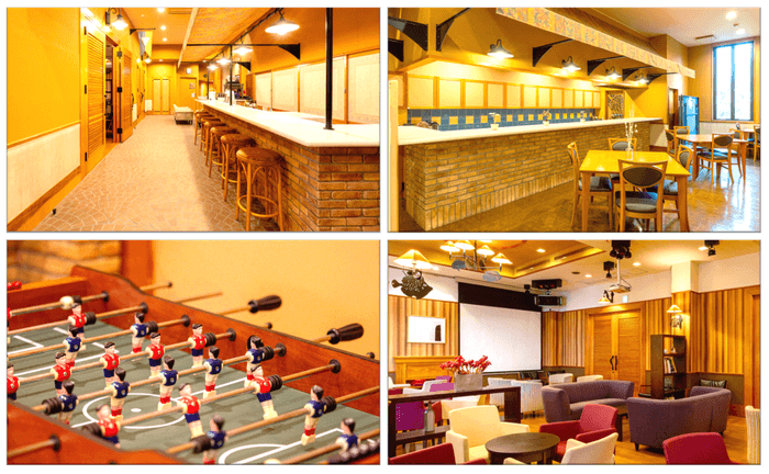 また、スペースの外には、カウンターテーブルやチェア、テーブルゲームもあり、受付や個別の作業、休憩時の交流の場としてもご活用いただけます。
