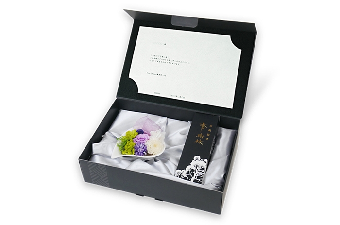 概要 :モノトーンの箱の内蓋にお悔やみのメッセージを付けて