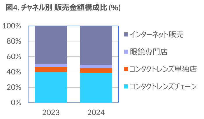 2024年におけるケア用品市場は金額前年比で8%減となった。コンタクトレンズチェーンでは10%減と大きく縮小した。また、主要チャネルであるインターネットでも5%減となり苦戦の要因となった。その結果、構成比はインターネットが伸長し、50%を上回った。(図4)。近年同様の傾向として販売店の意向やメーカー新製品が1日使い捨てレンズへシフトしており、コンタクトレンズ販売店においてケア用品の販売増加につながりにくくなっていると思われる。